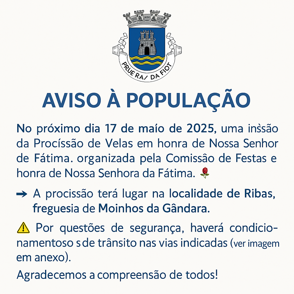 No âmbito das Festas em honra de Nossa Senhora da Saúde, a realizar-se na localidade de Ribas, freguesia de Moinhos da Gândara, informamos que haverá condicionamentos de trânsito por motivos de segurança: 📅 7 a 11…